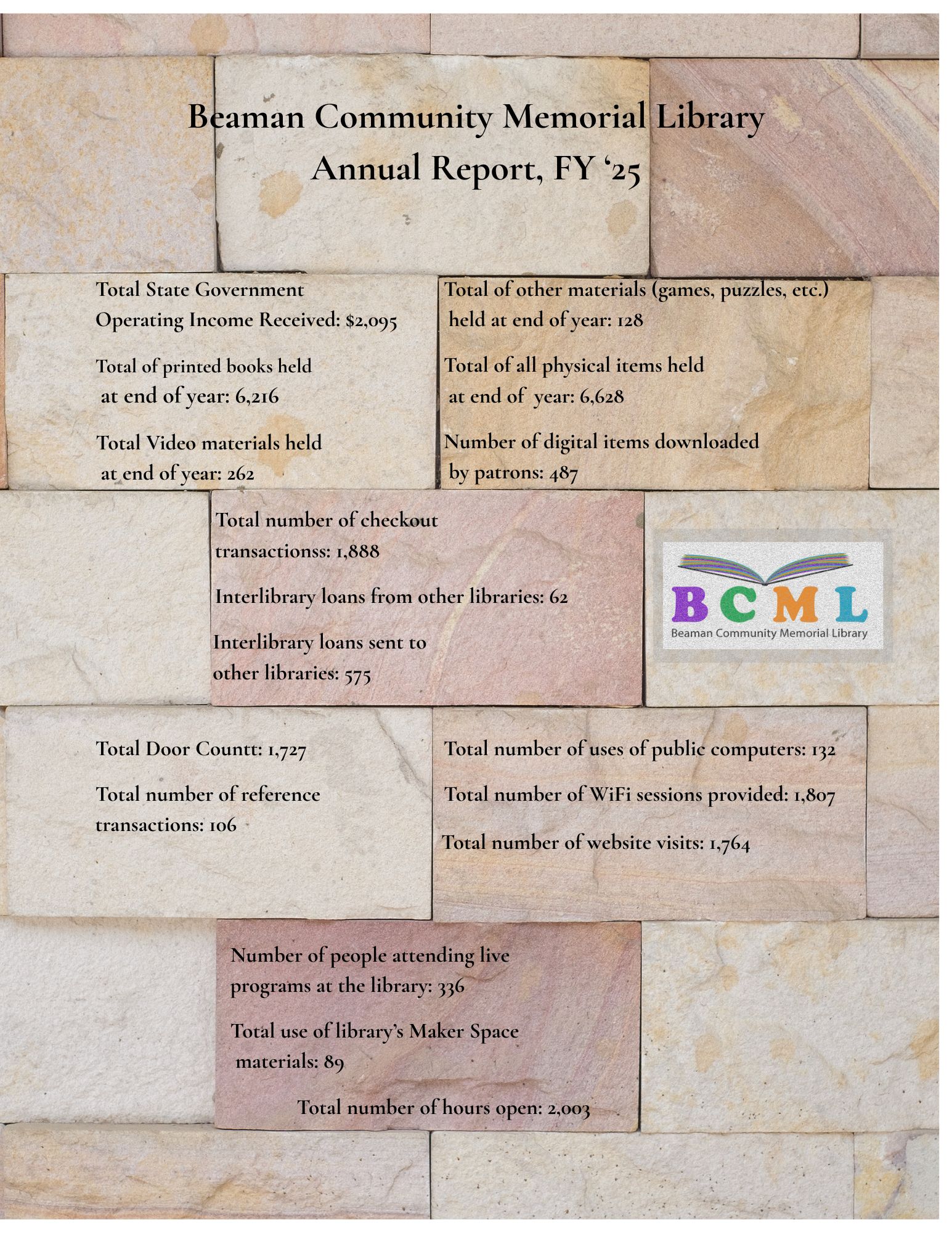 | Beaman Community Memorial Library Annual Report, FY ‘25.jpg | Beaman_Community_Memorial_Library_Annual_Report_FY_25.jpg | 11/14/25 | 620.35 KB | |