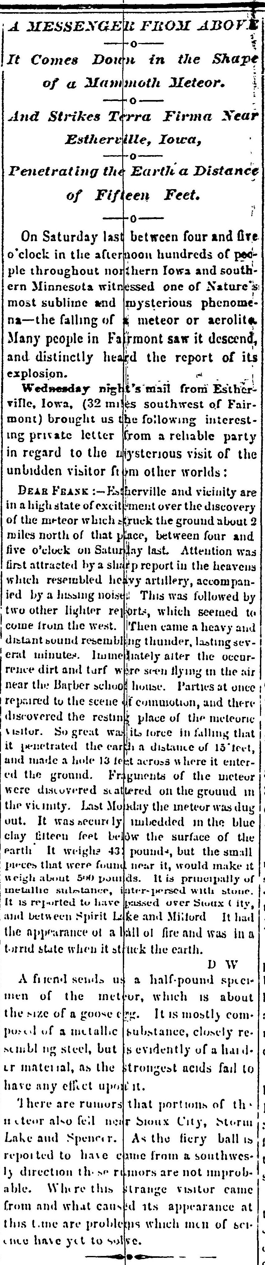 | A Messenger From Above, Martin County Sentinel,published in Fairmont, Minnesota on Friday, May 16th, 1879. Page 1.jpeg | A_Messenger_From_Above_Martin_County_Sentinelpublished_in_Fairmont_Minnesota_on_Friday_May_16th_1879._Page_1.jpeg | 9/12/22 | 814.48 KB |