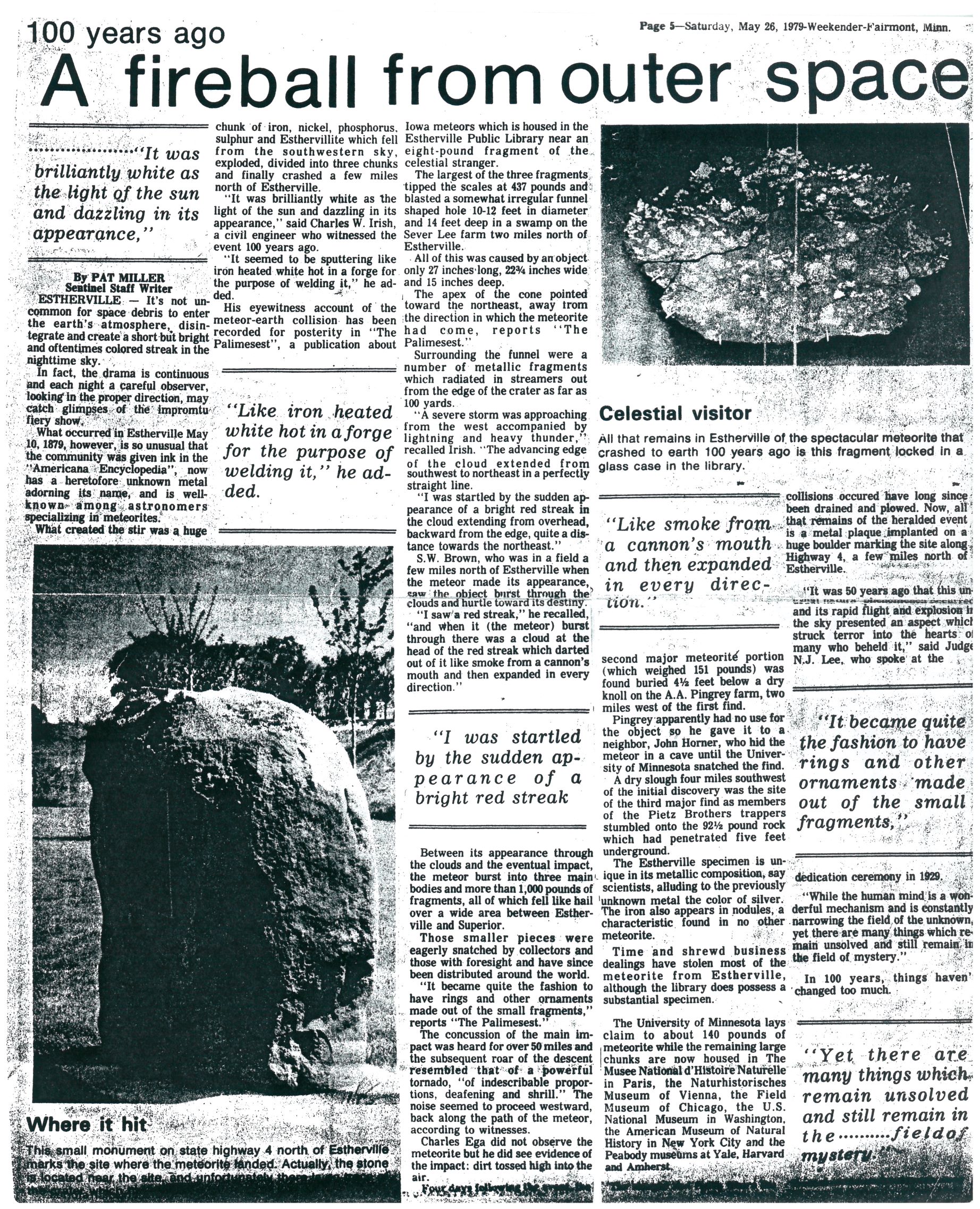 | 100 Years Ago, A Fireball From Outer Space, Sentinel Weekender, Fairmont, MN, Saturday, May 26, 1979, pg. 5.jpg | 100_Years_Ago_A_Fireball_From_Outer_Space_Sentinel_Weekender_Fairmont_MN_Saturday_May_26_1979_pg._5.jpg | 9/12/22 | 1,285.19 KB | |