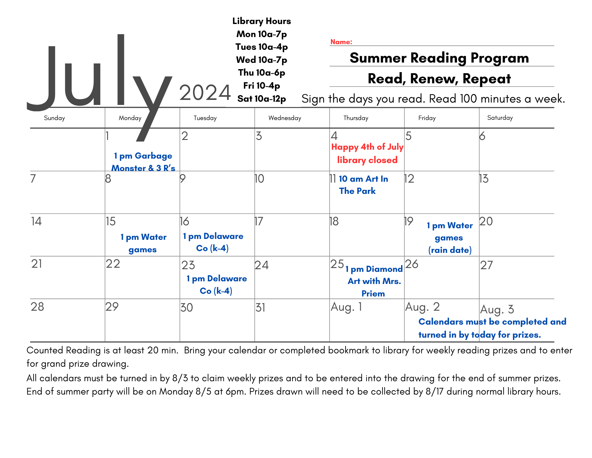 Summer Reading Program Finale will be held August 3 at the City Aquatic Center and Park. Submit all reading logs by July… Read More